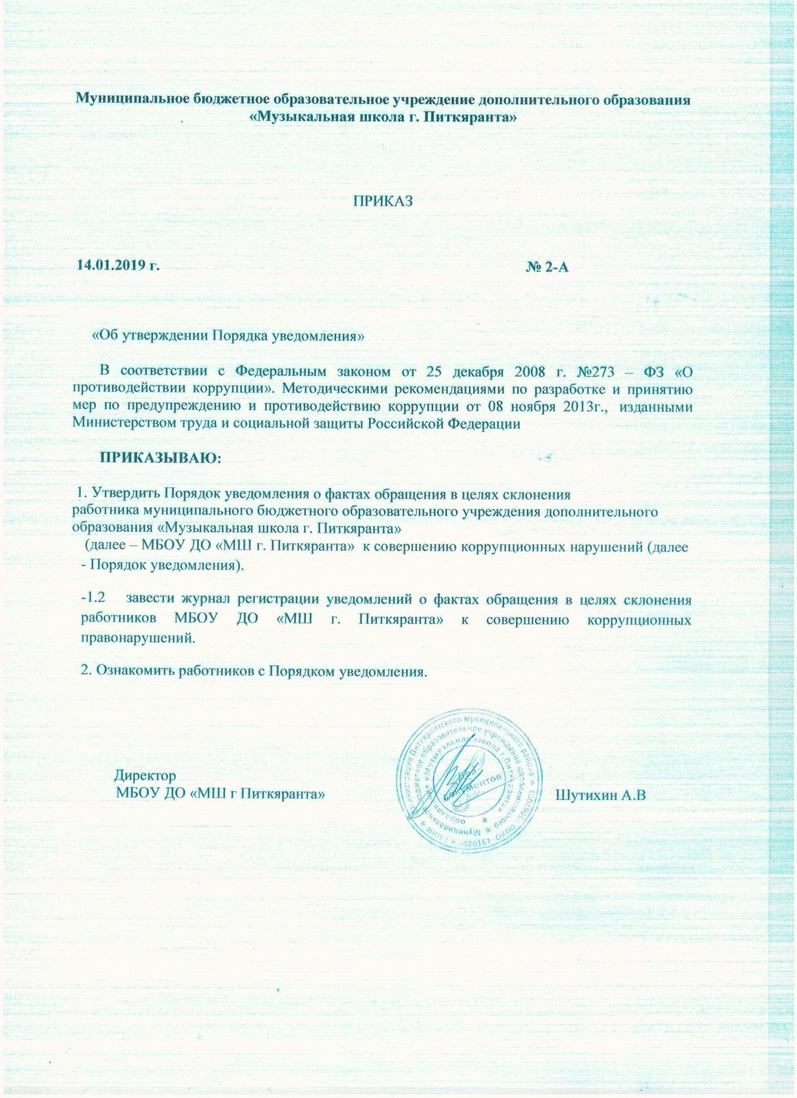 Порядок уведомления о фактах обращения в целях склонения работника муниципального бюджетного образовательного учреждения дополнительного образования Музыкальная школа г Питкяранта